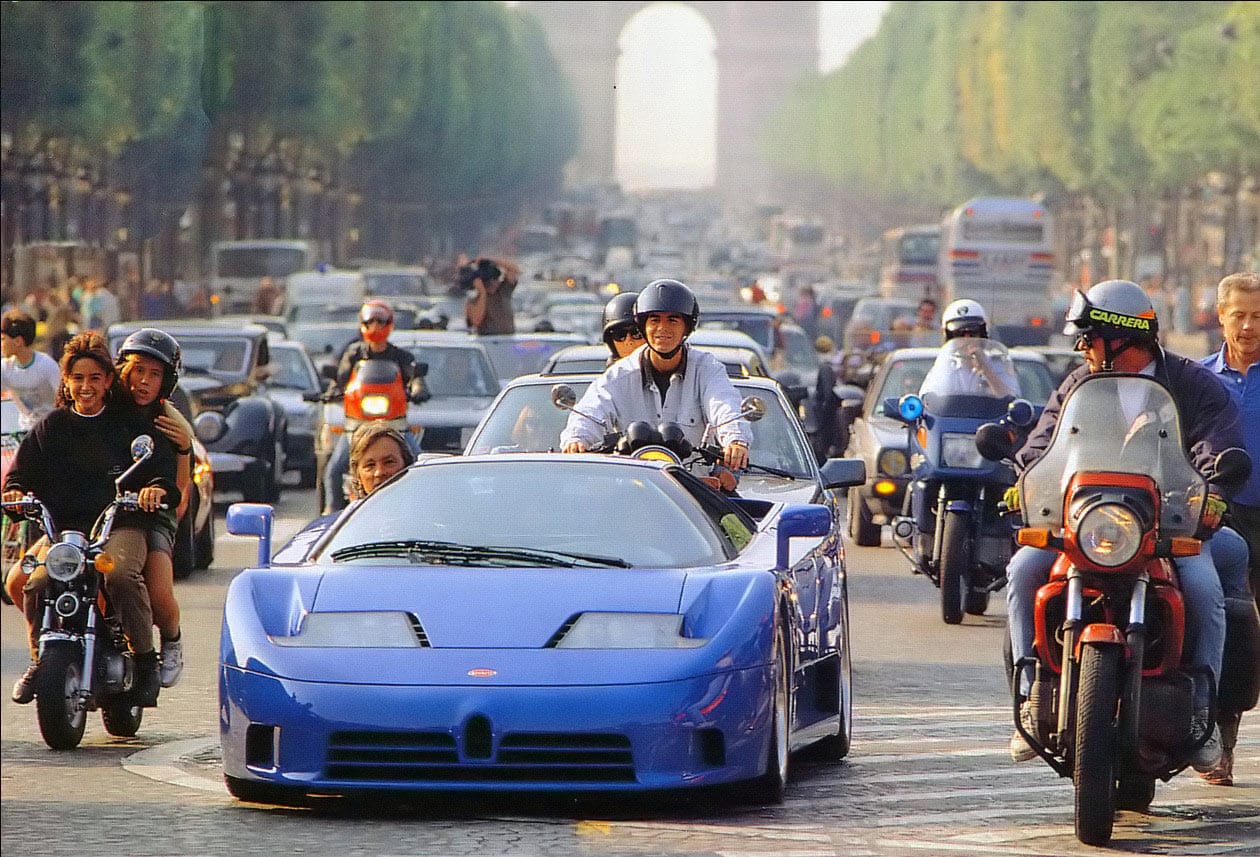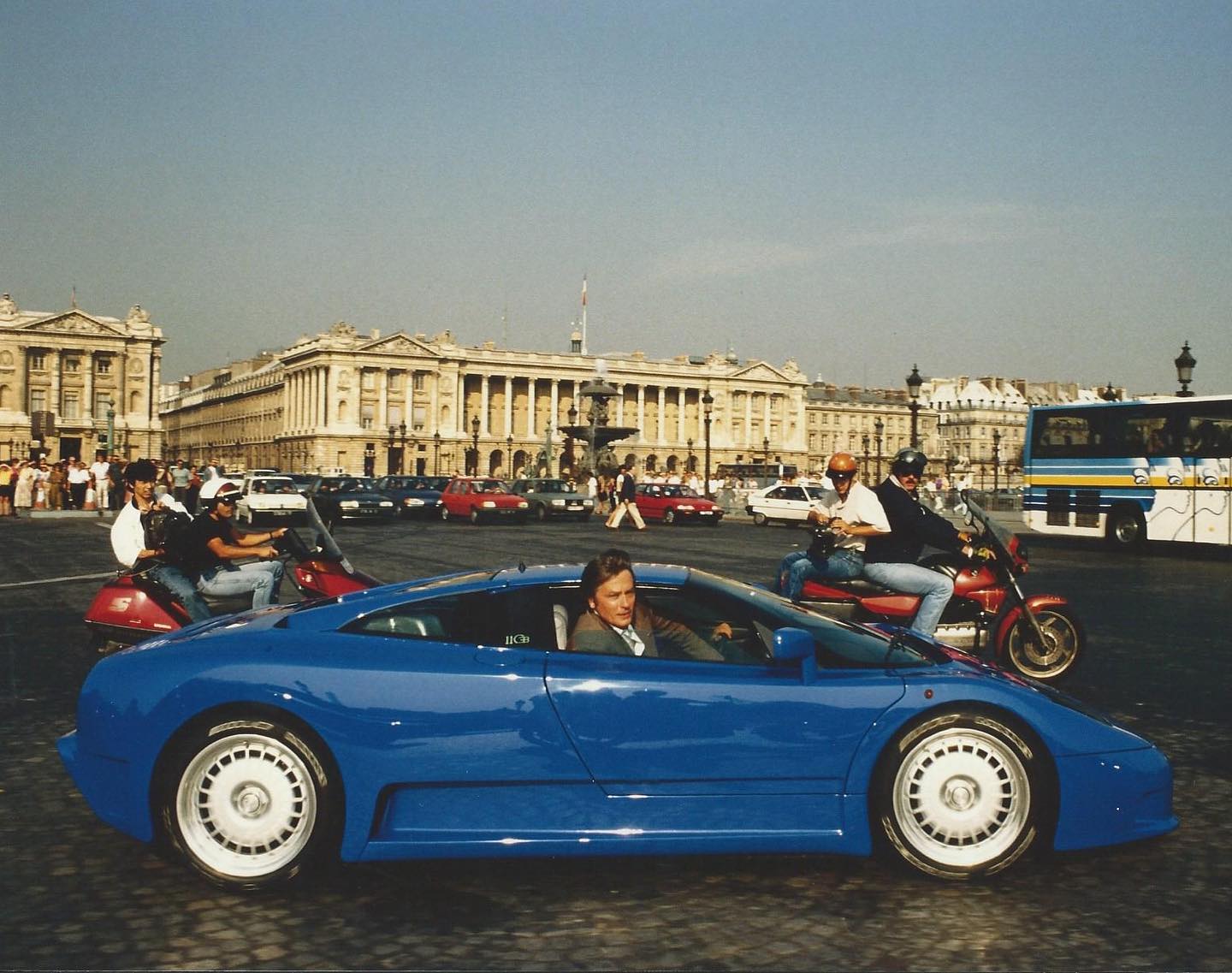 While the launch of the EB110 did little to save Bugatti from bankruptcy, the launch did provide us with some epic pictures of Delon taking a passenger ride across the Seine towards the Arc de Triomphe and into the Champs Elysées.
