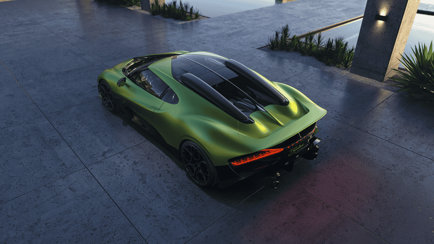 Step inside Brouillard, and the experience becomes nearly ecclesiastical. A glass roof pours natural light onto custom tartan fabrics and green-tinted carbon fibre, while a spine-like design motif flows from exterior to interior, binding the car’s surfaces into one harmonious sculpture.