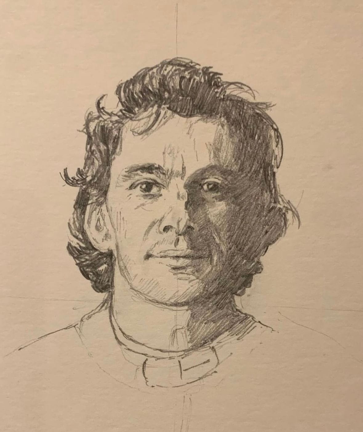 I really need to be more demanding. Then I do sketches and then I go from there and then it just goes to canvas. But even then it can change a bit, where I say well actually we can, these lines are moving all the time. I might have started further over and then I'm actually it's going to look better if we do that. It's a constantly moving process, which oddly, and I've still not come to the answer to this, one of our friends was saying why is it a painting and not painted, but I presume that is because it's constantly evolving and it's never really finished kind of thing. I don't know, maybe that's it, someone else may have the answer for that, but that's my interpretation.