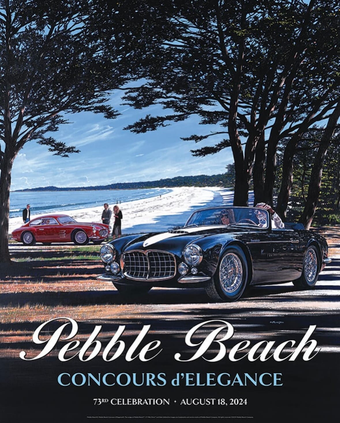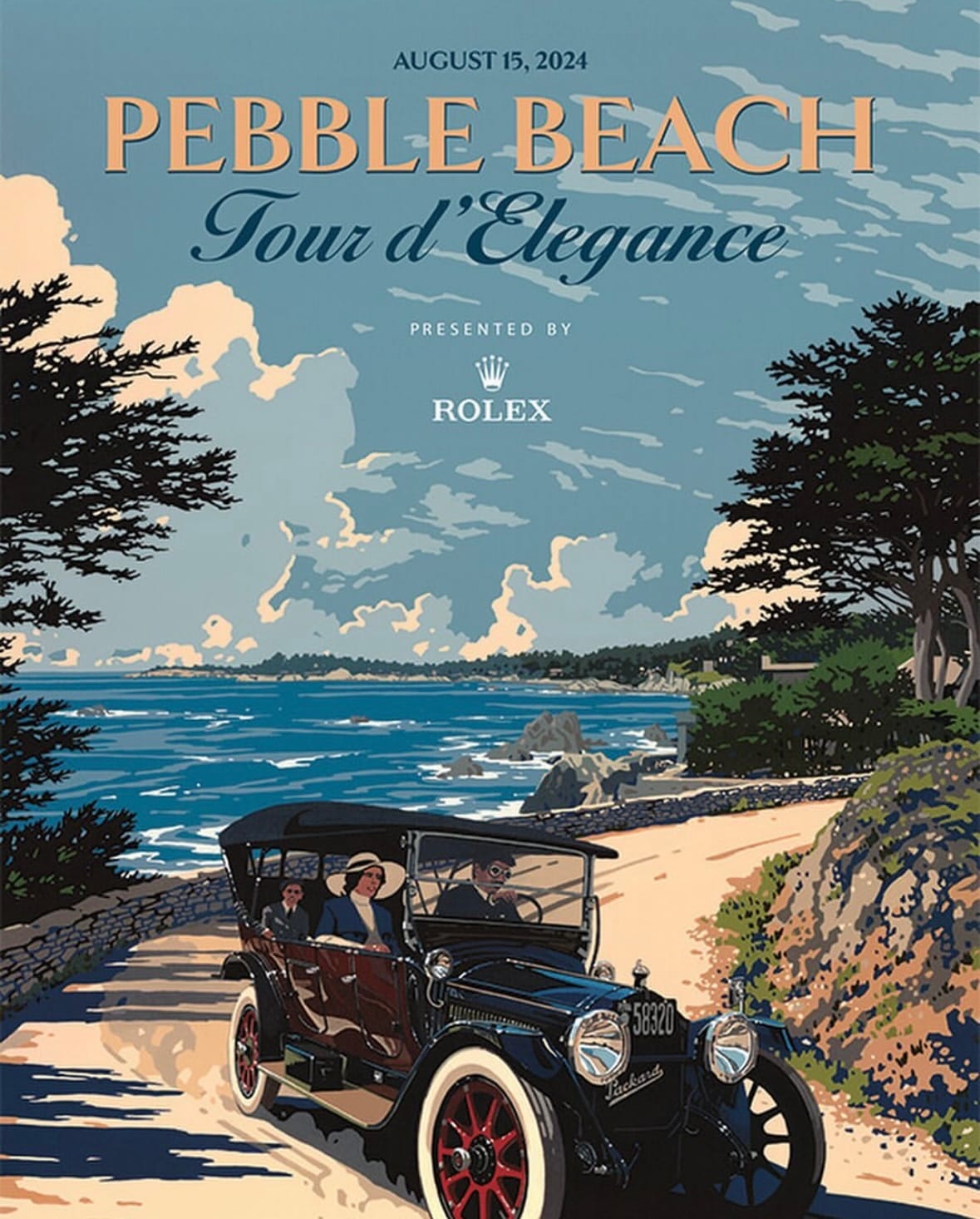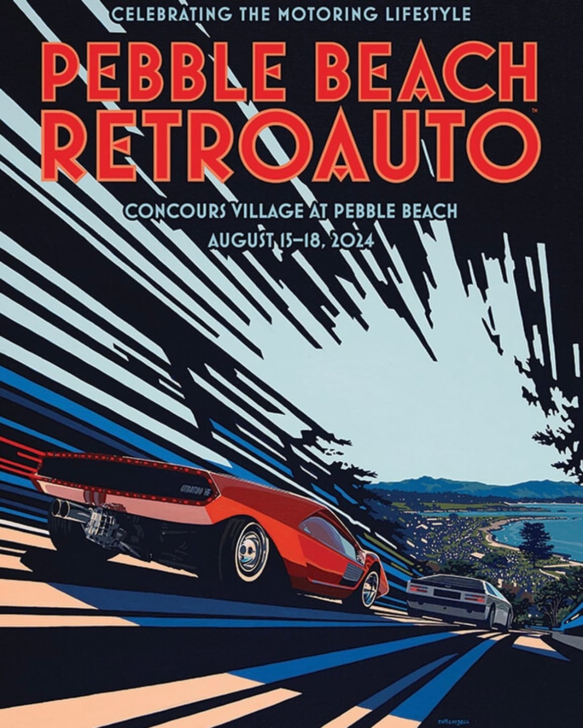 It's an exciting style because you can play around quite a lot with it. And obviously with this one particularly, I've bled the lights out behind the car and things like that, and you can really go a bit more interested with colour. The temptation is to go back into detail. Obviously this is a poster for Pebble Beach, so they like having the event in the background, and that is coming down to the show field. The hill wasn't quite that steep, let's say, but obviously you're trying to convey, it's a poster at the end of the day, so you're trying to convey that kind of thing. The cool thing about that one actually, for a start the cars are amazing, you've got the Lancia Stratos Zero, and then the Aston Martin Bulldog. The Zero is 50 years old, that car is 1970, and still looks quite modern. It's quite strange. The Bulldog, they're both revolutionary really space-age kind of cars. Obviously it looks 70s, but in a way it almost hasn't aged in a funny kind of way, it's still fresh. You see it and you go wow, really cool, the rear lights and things and the wheels, a very cool car. I think what's quite cool about that particular poster for Pebble, is that for them, Pebble Beach, they have everything from 20s kind of cars, and there's been a core of 50s and 60s cars, and I feel like they're trying to go a bit more modern now, which is exciting. I think where the whole classic car thing is moving, to the 90s and things, so they had the BPR cars, the McLaren F1s, XJ220s and things, so that's kind of a nod to the fact that the future is arriving at Pebble Beach if you like. I haven't got the McLaren F1s and things in there, but I think everyone can kind of feel that kind of changing a little bit and everything is moving a bit more 70s, 80s, 90s. I love 50s and 60s cars but there's definitely a momentum there I think to move forward a bit. I think they're sensing that and there was a bit of a leap of faith, which is really exciting and I think it's really successful.