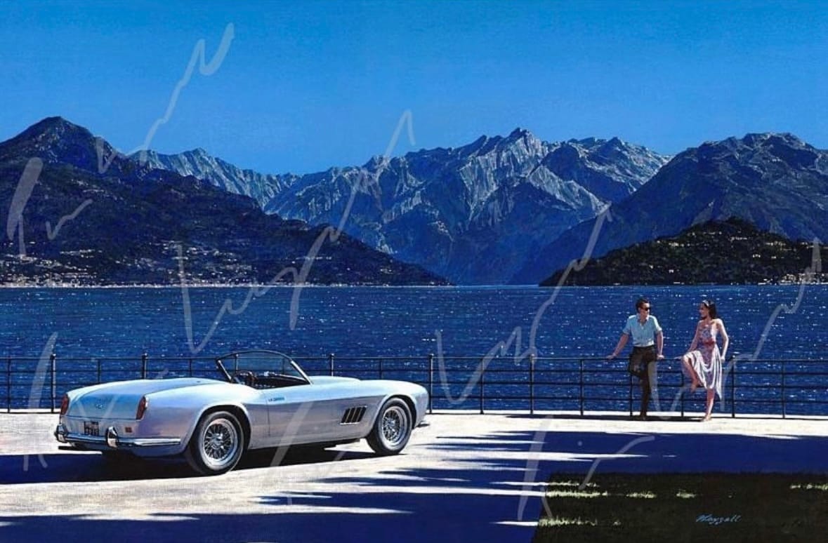 I've got a lot of books and I've just built up loads of saved images over the years, just researching, because ultimately historical accuracy is really important for me. Again it is slightly different at the Pebble Beach stuff, but most of my work is motorsport art, say Targa Florio in the early 60s. Obviously most of the material is black and white, for a start, so a lot of research needs to go into the colour. You get quite good at interpreting what colour that probably was, just from the tone and things, but then if you can find colour, then it's like gold dust. But that's essentially what I'm doing. Especially with painters like the GTO one, that image does not exist until I've painted it. I'm not painting something that already exists, I'm creating a new image. Sometimes you get photographers featured from the 50s and 60s where they've discovered new collections and things, and that's kind of what I try and do, is just produce something that nobody has ever seen before, of a famous race or a famous car, but then bring colour to it, which again, there won't be much of. That's really exciting when you see a colour 1950s photograph or 60s photograph, because you're like, wow, I haven't seen that before. That's kind of what I try and do. Obviously in the light that I use, I don't ever paint really neutral light, I really like dramatic shadows and brightness and depth. Well for a start it creates depth, but also people want warmth really on their wall. I do paint wet racing scenes and things, because that is cool, but people like to be happy. We are all happier on a day with a blue sky, and a lot of people like my blue skies and I just kind of think, well yes, that's what you want. You want to be there, you want to be happy, so I kind of do that.
