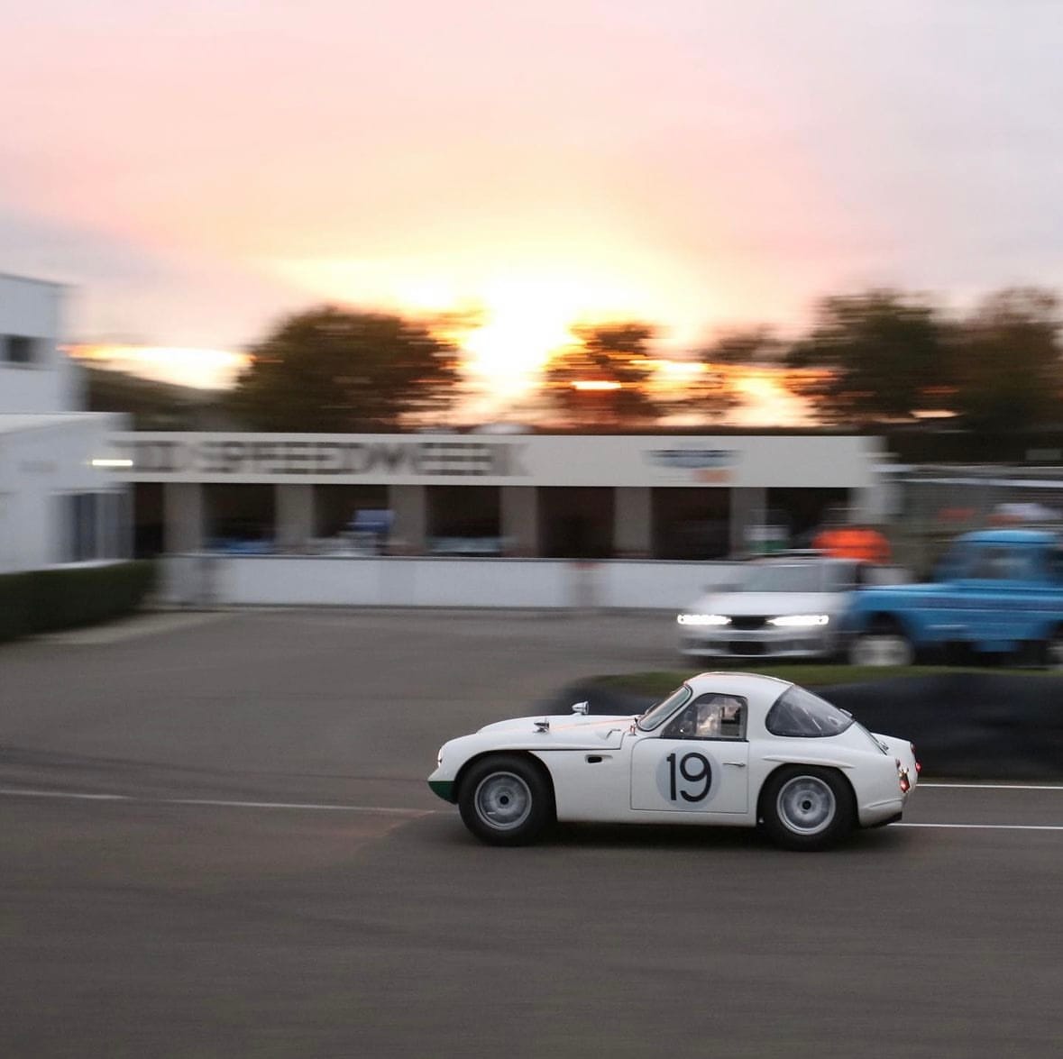 I was racing a TVR Grantura and I've raced that quite a few times at Goodwood over the last few years. Sadly I have sold that now, stupidly, I shouldn't have sold that. I try not to think about that, but that was a really cool car. That I had raced quite a bit at Goodwood in period, and then Nürburgring and Spa. To be honest, it had done so many races in period. Really impressive, Silverstone, Six Hours and things. I bought it and we raced it quite a few times. We did the Speed Week in lock down, which was actually, I was talking about it with a friend recently, he also raced there that week, and strangely I was going to annoy the spectators, but that was one of the best race meetings we've ever been to. Obviously there were no spectators because it was in lock down essentially, or just out of lock down, a semi lock down, whatever it was, and the event couldn't have any one there. I guess it probably made a difference that we had been locked up essentially for a long time, and it was the first time you were seeing people. But it was just incredible. You were there and you were pinching yourself that we were at Goodwood and we were racing. Obviously everyone had to keep the distance and they managed that really well, but it was just incredible. I did two races that weekend. and we shared the BMW with Marino Franchitti. Then I shared the TVR with Richard Meaden, Dickie Meaden. I think we finished 10th or 11th, this is the Moss Trophy, and it's really poignant because Sterling had died not long before, so it was a tribute race to him. That was quite amazing because I had met him a lot, and I painted him obviously a lot over the years, and I'd met him many times. So that was really amazing to be in that race anyway. But we were in the little TVR, which is only an 1800 engine, obviously a bit lighter, but we were in against all the Ferrari short wheelbases, E-types, DB4 GTs, so fast stuff, and I think we finished 10th or 11th, which is pretty impressive against all the E-types things. We beat a lot of heavy, big machinery sort of thing.