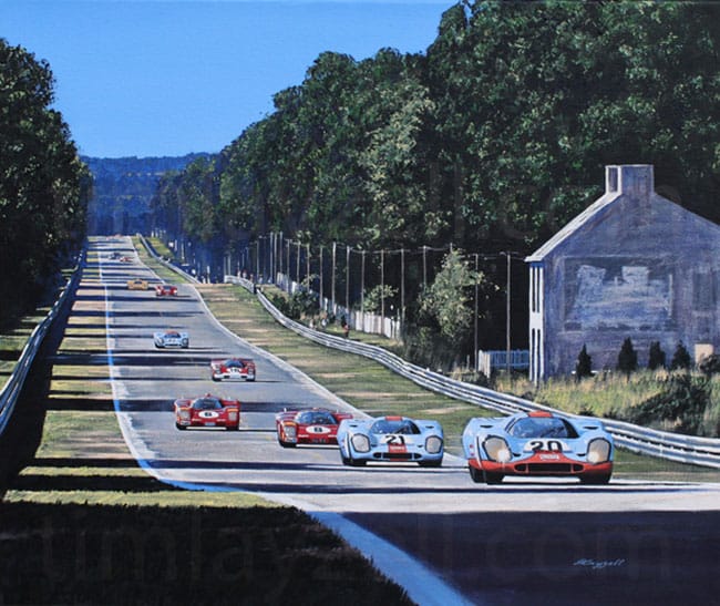 This is complicated because obviously I have done things for manufacturers. They are all great cars. I do paint quite a lot of Porsches, just because there are so many people who love Porsches. Their race history is really cool, certainly from the mid to late sixties through seventies and eighties, and their liveries are quite cool as well. I started out really liking pre-war stuff, Bugattis and ERAs and things like that, then I got into fifties, like Maserati 250Fs. I suppose ultimately Ferraris really. I just love 1950s, 60s and 70s Ferraris. I usually end up painting more sports and GT cars. I don't know why that is. I guess that's because I like the shapes, maybe. It also goes with drivers. I really love painting Fangio, Jim Clark and people like that, Pedro Rodriguez in the Porsche 917 and stuff like that. Sometimes I'm led by that, although great races, and it's a slight cliché, this is a long answer your question. This is a complaint my kids have when they ask me a school question, they are like dad, we haven't got time, short answer or long answer. My son had homework yesterday, he's got to interview someone and ask them the meaning of life, and they were like don't ask Dad. A 250 GTO is amazing, not because it's worth the most money now, that's irrelevant to me, it's what they did in period, they were raced and crashed and smashed. If you look at the Tour de France, for example as a race, they raced and literally the fronts were hanging off the cars, there's nothing left of them, headlights hanging out. So for me, that's all I was talking about with the TVR, where it didn't have the original chassis, but that doesn't matter as long as it's traceable. That's more exciting than a low mileage unused vehicle to me, because it's got a story to it. It's been smashed, but that's cool, it was smashed by a really famous driver on a really famous race in the golden era of motor sport, what's cooler than that, who cares if it's original? If it's original and it's unused from new, what's cool about that other than the fact that it came out of the factory? That's just not exciting in the same way. I guess the stories behind all the pictures are what I find fascinating. So that's your long answer.
