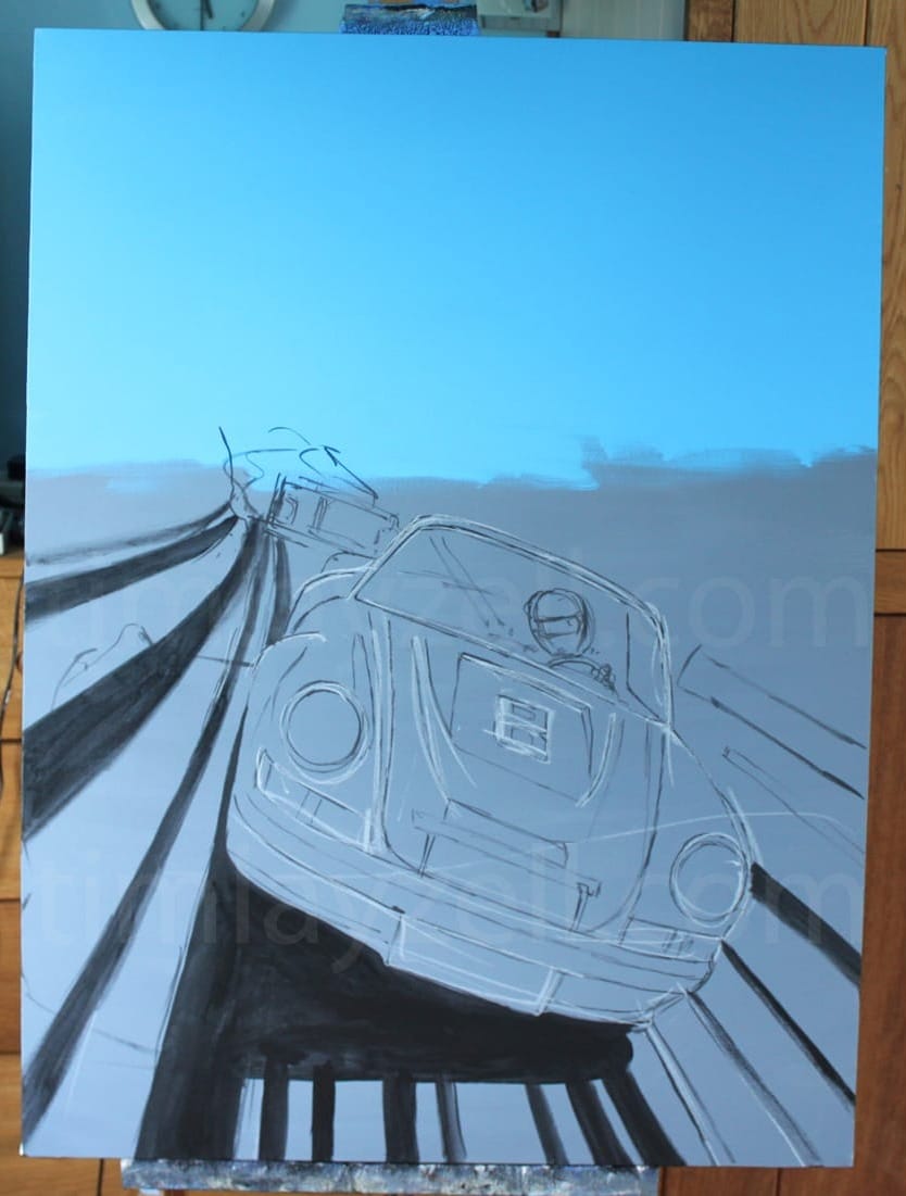 Well it might have been easier. There's two ways you can think of it, you could say well then I might have been a bit more generic, but then it might have short cut to things that's taken me years to realise. Nowadays I guess you've got YouTube and you could probably just YouTube it and just say well how do I do that? Most of the time when you're at the easel, it's problem solving, you're kind of like, how should I do that? Sometimes when I'm on a mega deadline, I work really quickly, and it just speeds up your decisions, and that's ultimately what it is, because you're like, well I've got to try that. If I don't try it, I'm not going to get this done. So you just try stuff. If it doesn't work. The good thing with acrylic is that you can just paint over it, to a degree, obviously you can't slap the paint on because then you'll see it through, so you've got to be a bit tentative but ultimately you're trying stuff all the time and then you can, particularly with styles like that, you're kind of like how complex do I make the trees? I couldn't make them so complex that you couldn't then see the writing over the top and things like that, so you're always kind of, and then you don't want to detract from the car, it's all winging it a bit, to a degree. Obviously, I'm not really, winging it is wrong now. I don't ever throw a painting away now, but I don't really have any failed attempts, and I haven't for 15, 20 years, because I would spend a long time thinking about how I'm going to do it. I guess I've got a good recipe that know works. It's complicated within that experiment. You're obviously trying to experiment, but you don't want to experiment so much necessarily that it fails, if you haven't got time. That's the slightly complex thing. I have a really long waiting list, I have a 18 months to two year waiting list for commissions, which is amazing. I suppose that I don't experiment quite as much as I would if I didn't have any waiting list, you could go a bit more bonkers with it. It's a tricky balance that, because I know things are going to be seen again, they're going to be featured in magazines or books and things, so it's more that I'm going to see it, I know it's going to bug me when I know it's not right, so I work really hard to make sure it's right.
