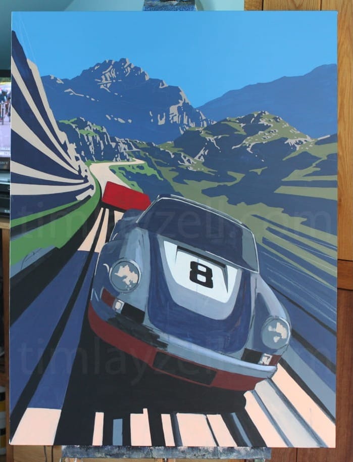 My wife, she's a medical student, and when she was living in her student house with her friends, they were all experimented with painting pop art pictures, and one of the bars we used to go to, used to have the Liechtenstein paintings with the fighter planes the power kind of thing, so I was hang on a minute, I could do that with cars. Then I also liked George Ham, which is pre-war Monaco posters and things like that. Then I quite liked the railway art of the 1950s, so I kind of culminated everything together, and I thought well, that would be really cool if I could generate speed, but in a really simple style. That's kind of where this kind of style has led to. This is the ultimate development of it, whereby there is a bit more detail these days. When I started it, it was much more basic. I try and pair everything down as much as possible and put as least detail – the least detail, the better in a way. But that is quite hard to do. So it's more a case of what do you take out? Because obviously I can do the realist style where I put loads in, loads of details, this is more a case of, what can I leave out but still retain the speed and also the detail? I think what a lot of people like is the shapes of the cars, obviously you've got to get that right, but not only that, you've got to get the handling characteristics right, so the lean on the wheels, the angles, is it braking, is it accelerating, is it drifting or is it just doing four wheel drift? I think that's really important to get that right, and that's obviously what I spend a lot of time doing. And although they look simple, they actually take longer than …