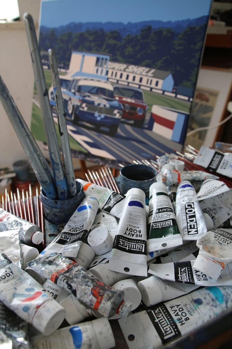 So he helped me early on with the painting and stuff, but at school I did paint cars but obviously as you can see I paint loads of other stuff, I paint people and landscapes, predominantly things like that, that painting they are a landscape with a car in it, so for me that's really important to create a picture. So in a way I never really got the fact they didn't like me painting cars because they're really hard as well actually. They are hard if you want to make them look real and look like they're moving in a certain way, and that's why I've built up over 30 years really, suspension movements and stuff like that. My art teachers were not interested in me. I may have been a muppet at school, I was frustrating probably to teach at school, I didn't particularly get on with the whole experience, but I did like doing cars and when I left school after A levels I just started doing it as a full-time job. Because I had already started, as I say, at age 13, so I was doing it. When people were doing their GCSE research, I remember I had my first exhibition at Goodwood Festival of Speed, I think when I was 15. I was still a year before GCSEs, and I remember finishing school and then trying to get some stuff finished to have an exhibition. So it was always that challenge, but I am essentially self-taught. So all the things I'm talking about, maybe they would have taught me at art school, I don't know, but I've picked it up.