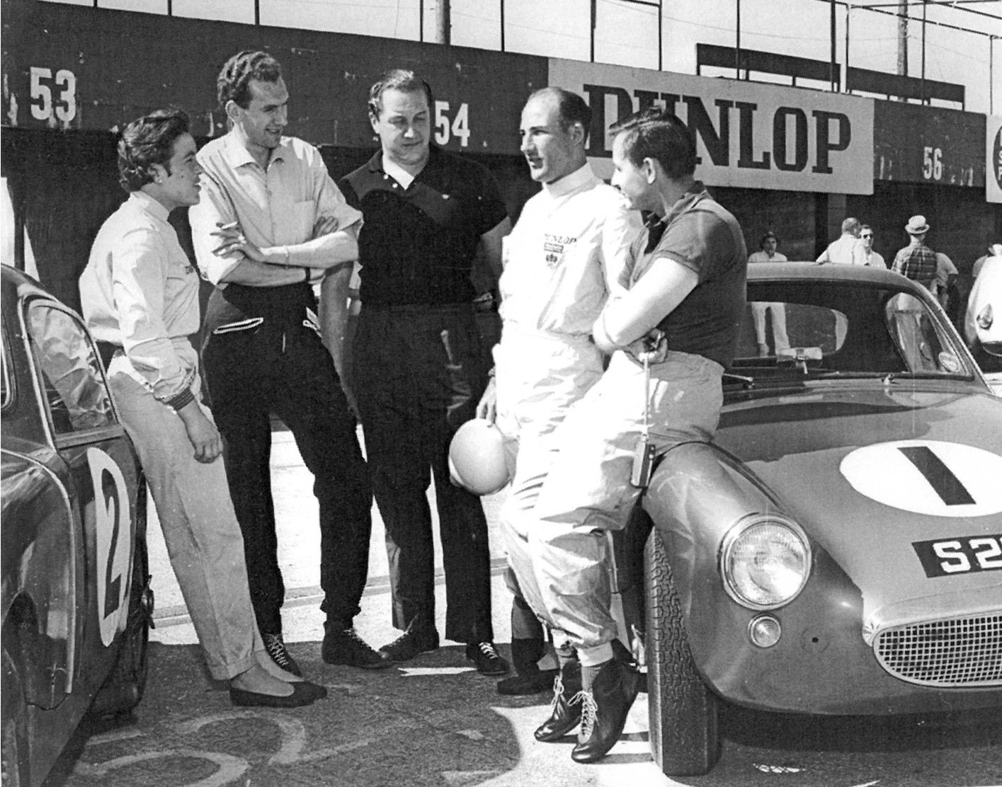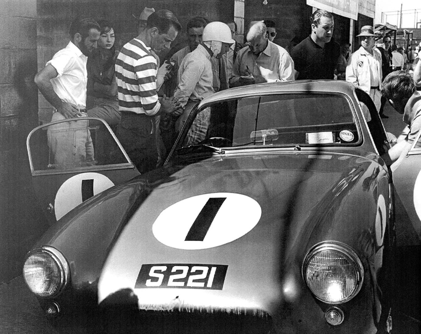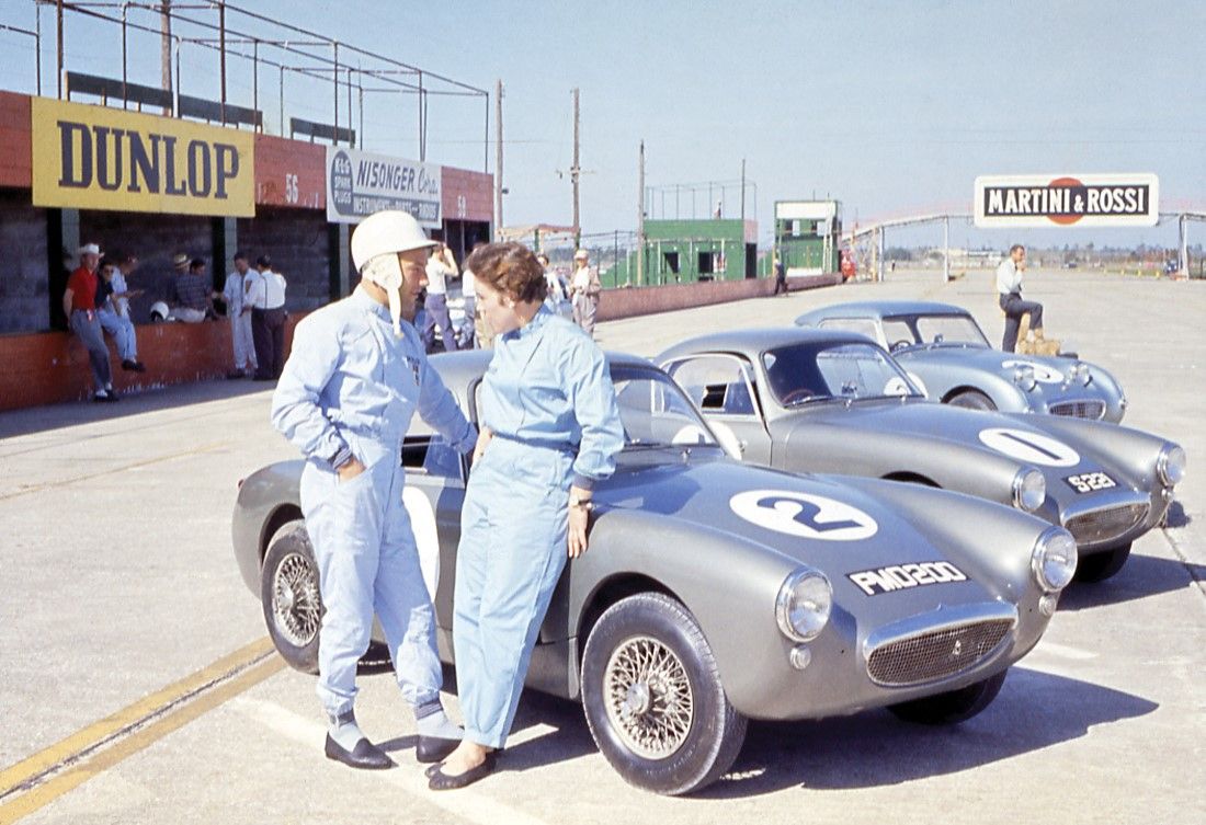 The 1961 Sebring 4-Hours where Stirling Moss qualified 'S221', then due to a slipping clutch it ended up being driven in the race by his sister, Pat Moss, and Paul Hawkins. The bottom two photos show then owner Cyril Simpson, as well as the creator of the Sebring Sprite, John Sprinzel, and Paul Hawkins. Source: Cyril Simpson Photo Collection