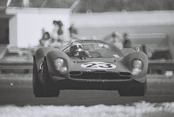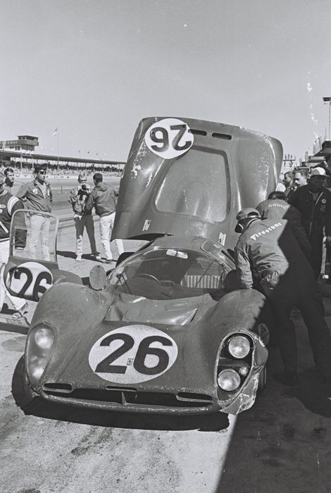When the green flag fell, Hill’s Chaparral 2F quickly took the lead, leaving the Andretti/Ginther ‘rabbit’ GT Mk II (whose original task had been to push competing Ferraris and Chaparrals beyond breaking point) lingering behind. A slow trickle of Ford pit stops began soon afterwards. When the leading 2F crashed out of the lead about three hours into the race after losing control on a section of loose asphalt, it was not a Ford which took the lead. It was a Ferrari.