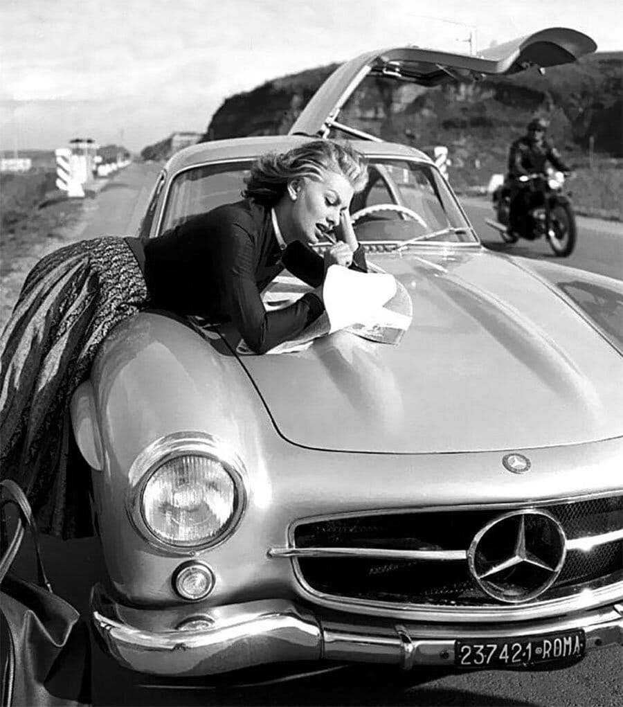 Legendary Italian screen siren Sophia Loren owned a silver Mercedes-Benz 300SL Gullwing, which was a gift from her husband, film producer Carlo Ponti, in 1955. She was frequently photographed with it during the height of her career in the 1950s. Loren wasn’t just a passive owner—she drove the 300SL in prestigious events, including the Mille Miglia and the Rallye del Cinema, an exclusive Italian rally where film stars and directors showcased their cars.