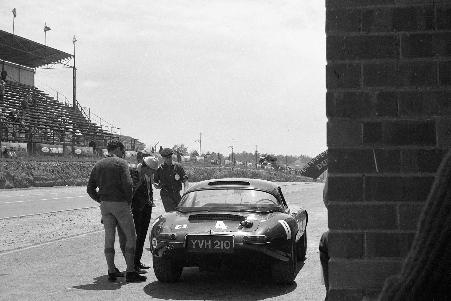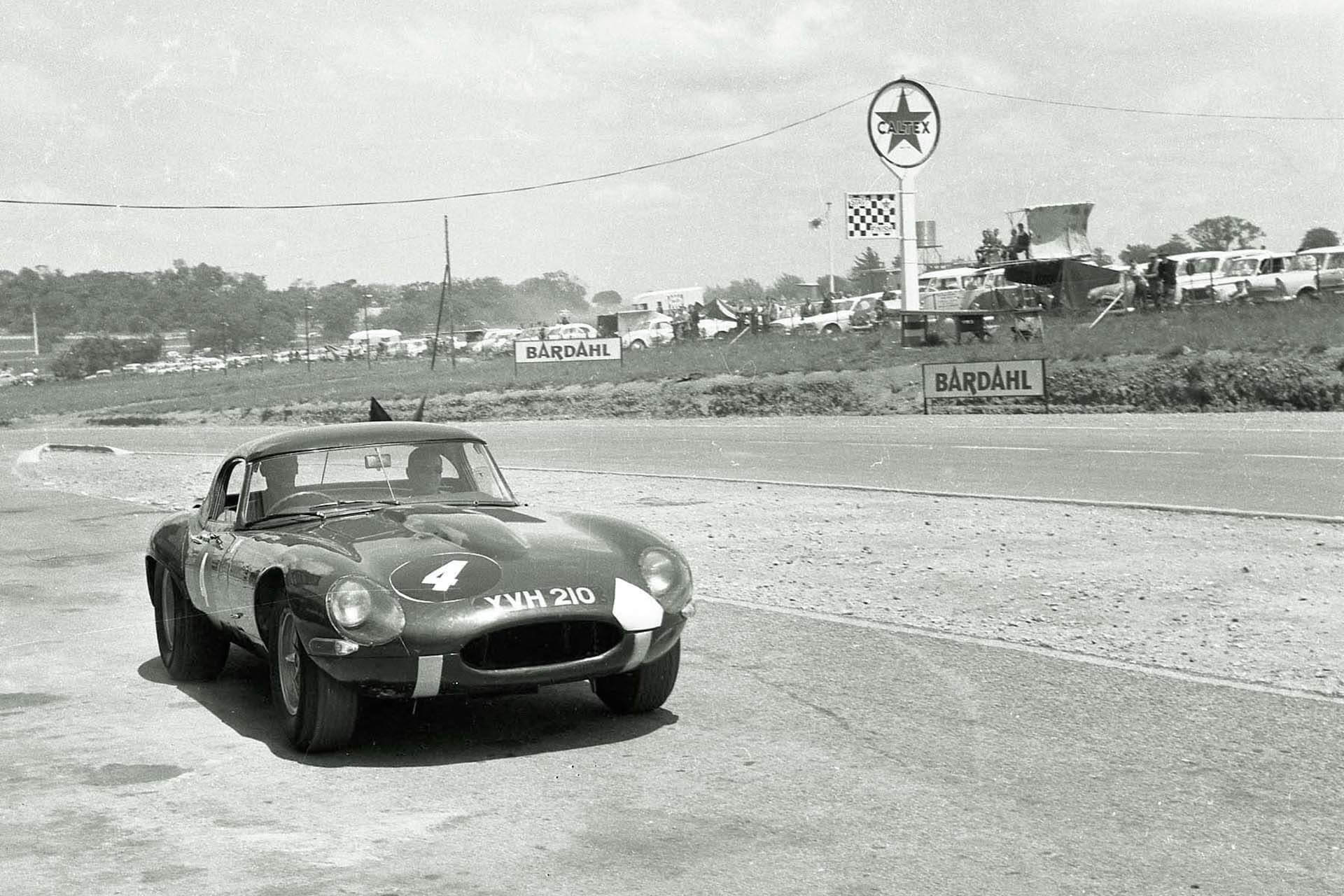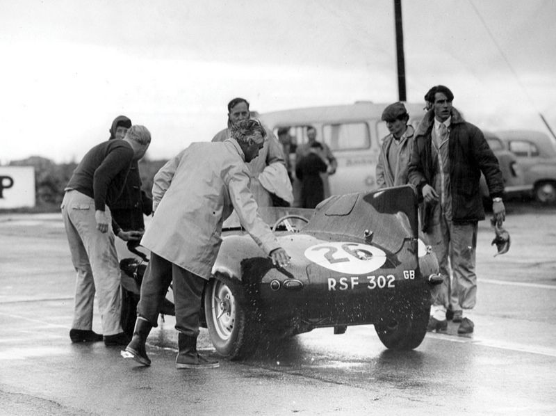 It didn't come to the end, but it did get, ahem, modified quite considerably. It was a long distance race held in the pouring rain at Snetterton, and the field had thinned out hugely. The only cars in front of me were Graham Hill in an E-Type and somebody else. I was third behind them and not threatened by anybody (and I wasn't threatening the leaders either); coming down the Norwich straight, a stream had suddenly broken through a large puddle and flooded the track, just at the braking point for the hairpin. So the rear of the car became light and got away from me, span round and charged backwards towards the infield. I remember looking over my shoulder and seeing that the car was heading straight for a marshal’s post, which in those days was just a mound of earth with two chaps standing behind it. I remember quite plainly watching them shifting first to one side, then the other, as they tried to decide which side I was going to hit this thing from. I hit it backwards, still going pretty fast, and I was thrown out onto the track. I wasn't really hurt, although there was a crack on my crash helmet. The car barrelled off to the other side of the track and looked very sorry for itself...