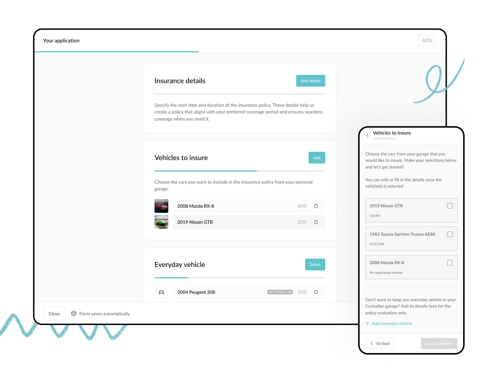 By showcasing your enthusiasm and building a digital garage on Custodian, we can produce a more holistic presentation of your car ownership than traditional brokers. The result being that insurers are more willing to offer cover and terms for exotic or unusual risks.