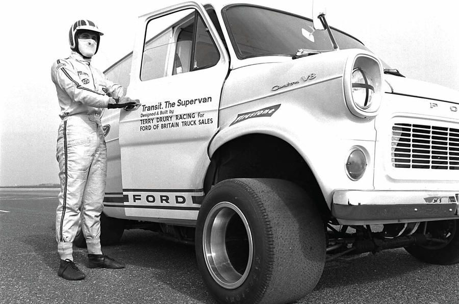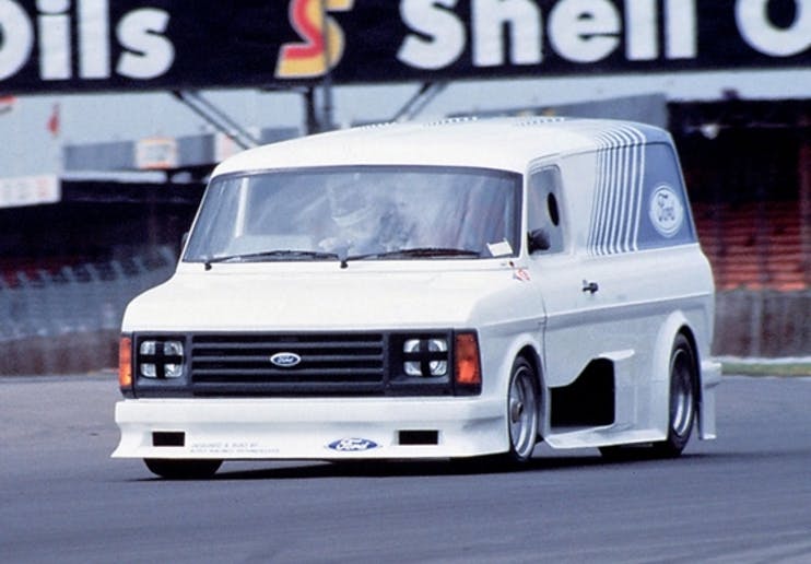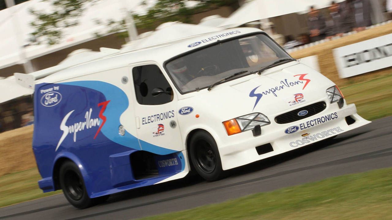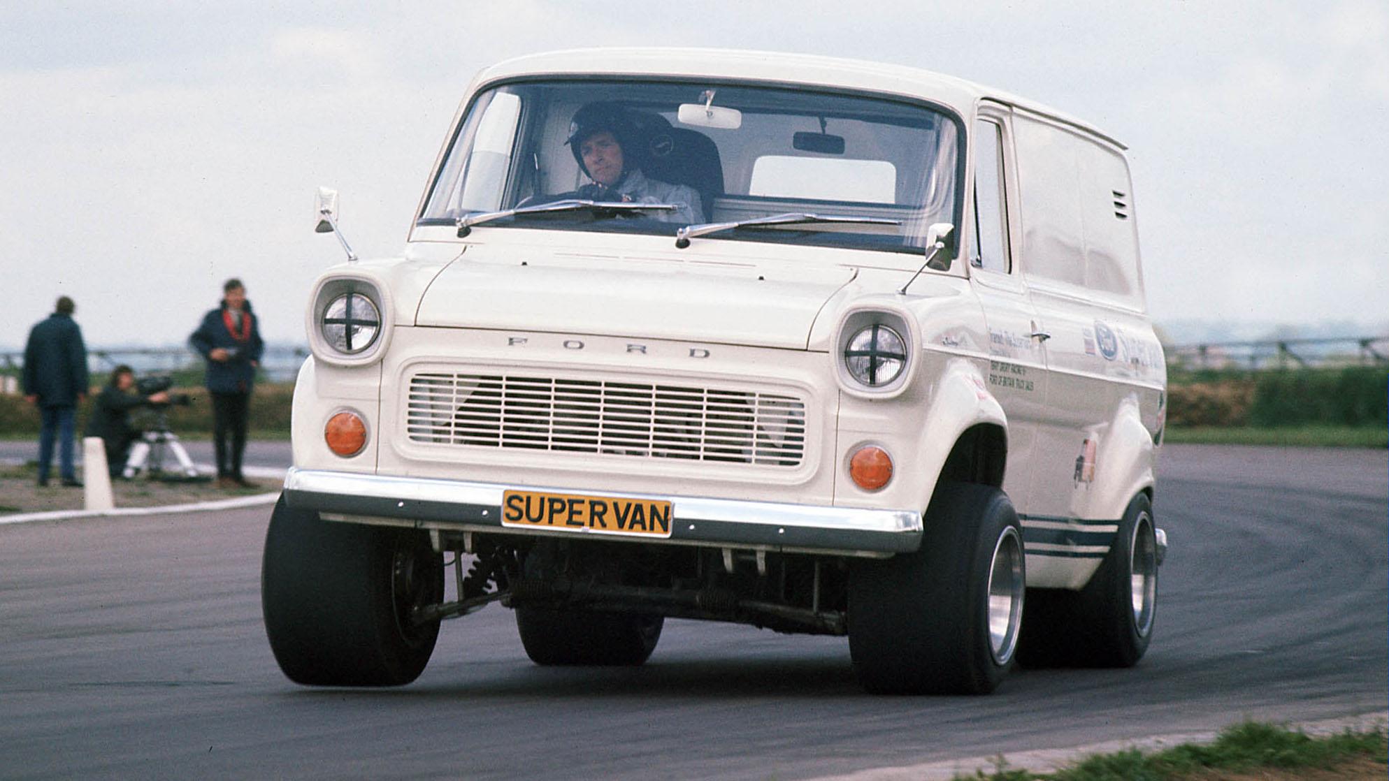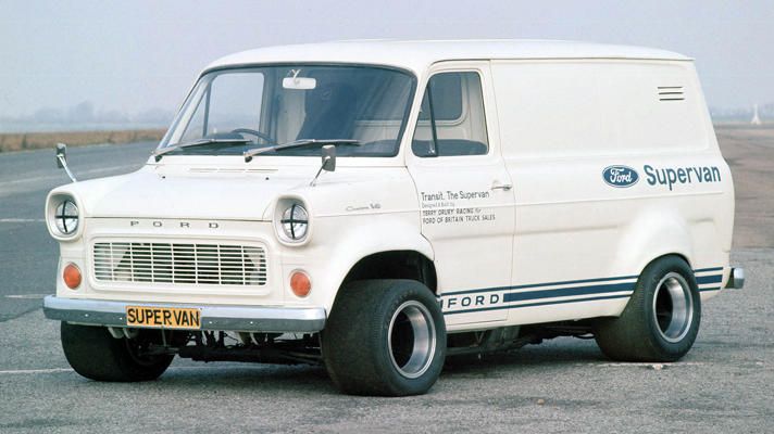 It was in April 1971 that the Ford PR department delivered a triumph of a van to the general public. Where the regular Ford Transit has a V4 Essex petrol engine, the example roaring round Thruxton circuit in front of thousands of screaming fans was equipped with something rather more potent: a Gurney-Weslake 302, essentially the same engine as in a GT40. With a race-spec chassis and suspension, and with the whole of the cargo bay taken up by its monster engine and imposing exhaust, the original Transit Supervan (built by Terry Drury Racing) is surely one of the finest goods vehicles ever to exist. That is despite its inability to actually carry any goods, of course.
