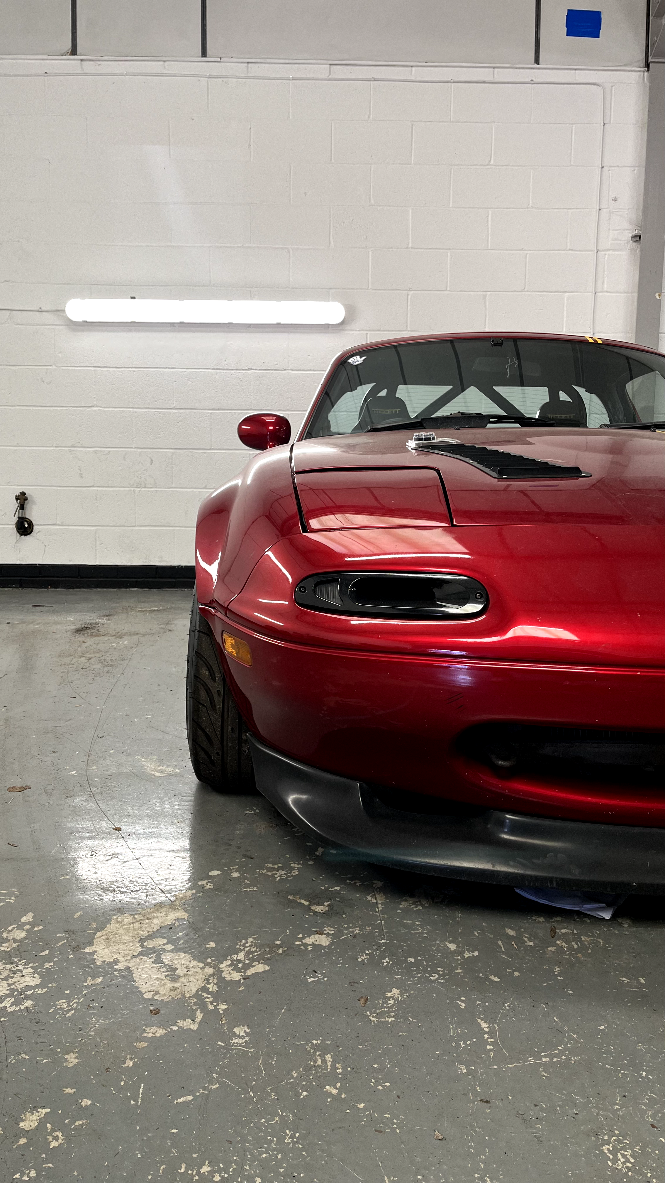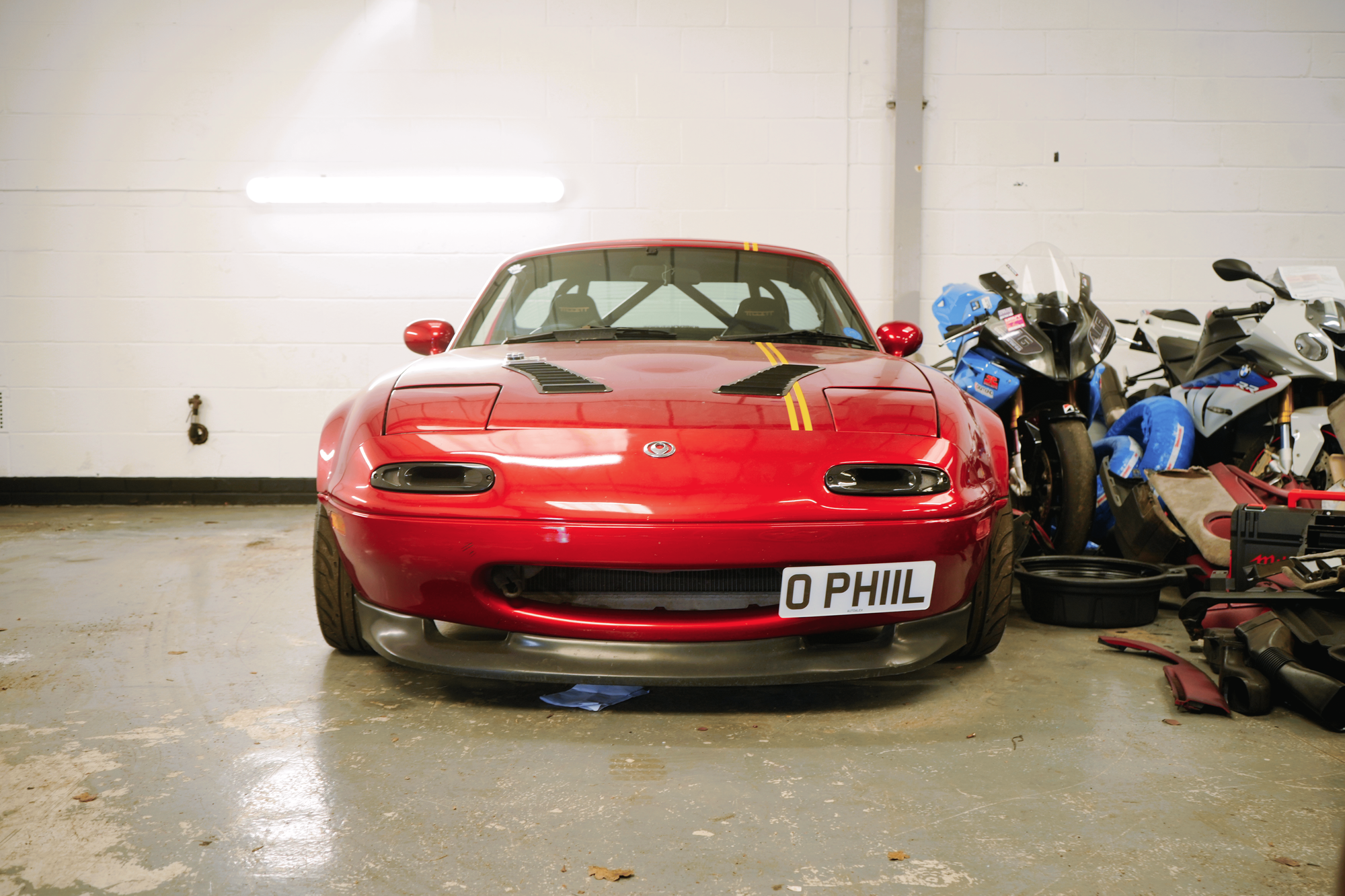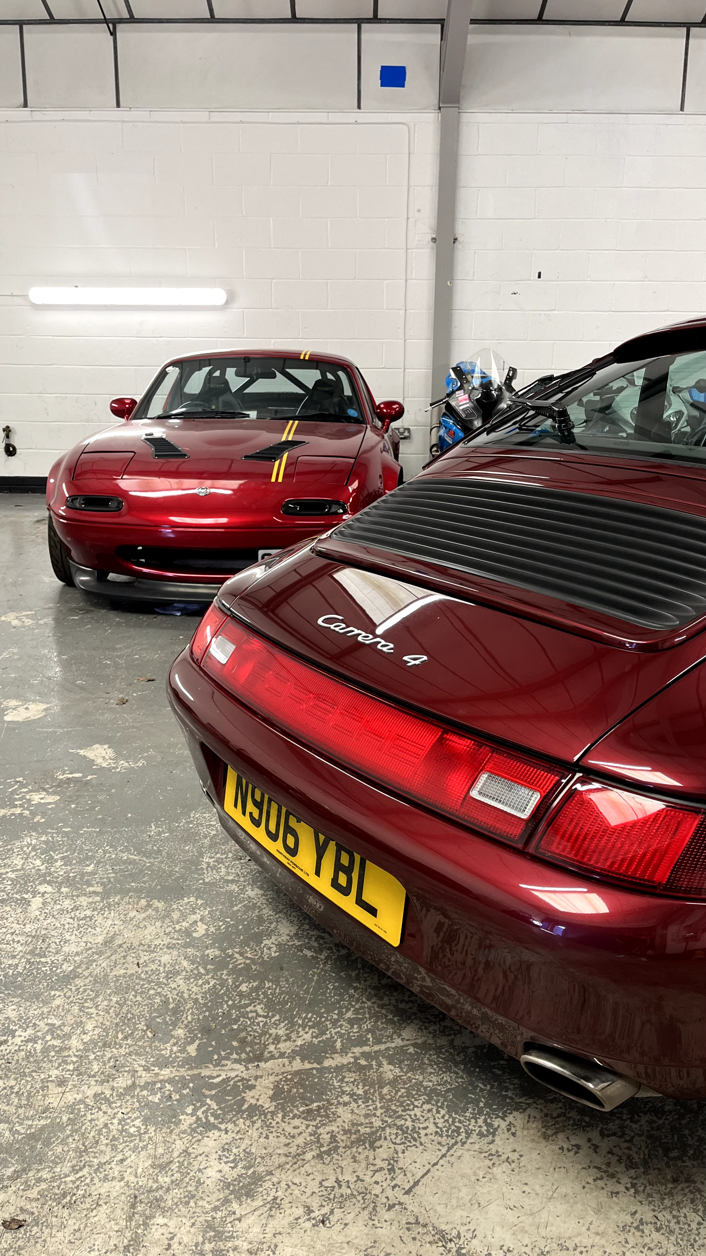 That's easy. E46 M3 Touring, which is being built. Nigel my 993, because I absolutely adore 993s, my favourite generation of Porsche 911, and Phil, my V6 MX-5. You have something for everything. You have your GT Cruiser, your track car and your car that you can drive to the Nürburgring and do a lap and then drive back, at 160 mph, that being the E46 M3 Touring. We have a red car, purply red car, and then a techno violet BMW.