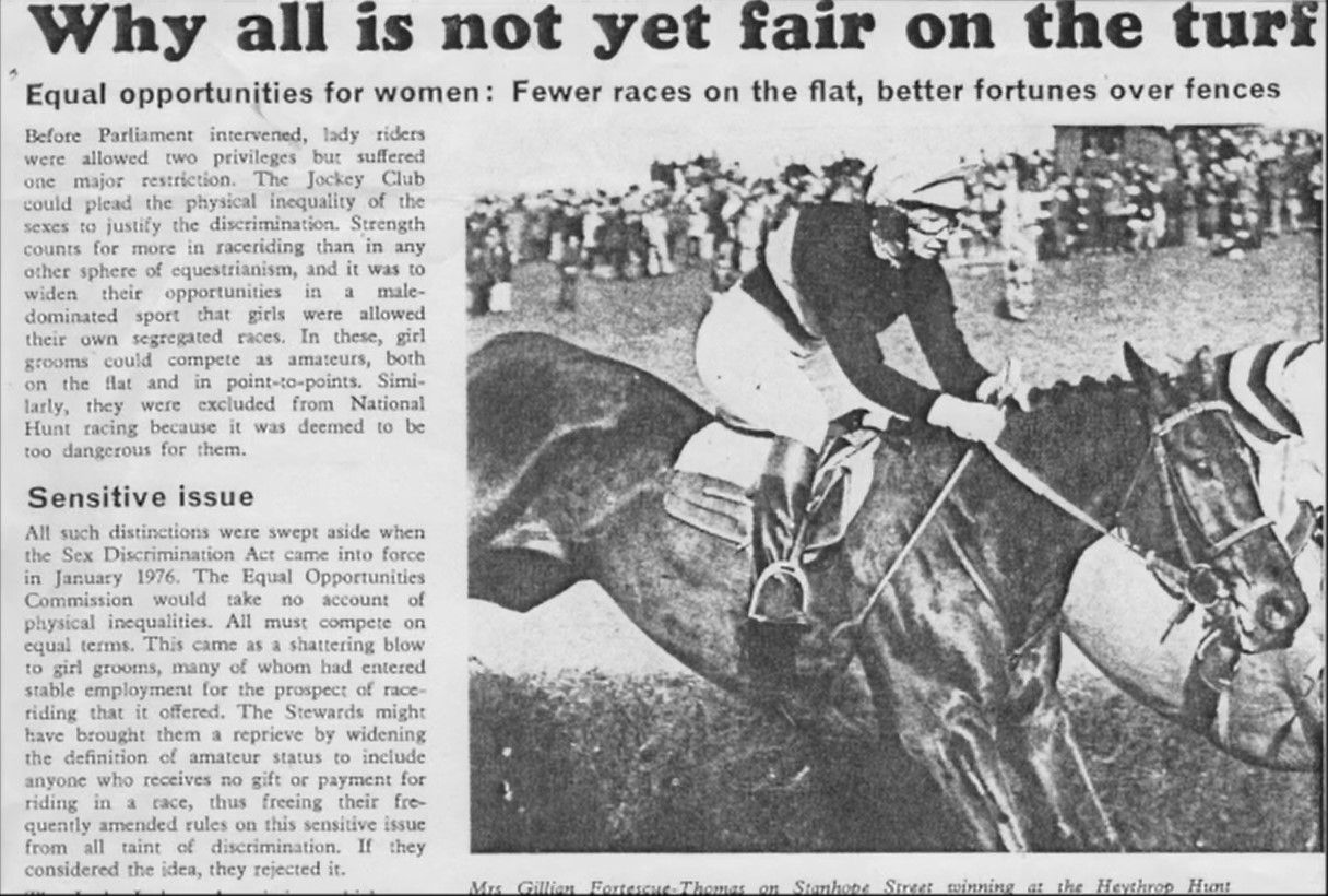 The one thing that was different to when I went as a jockey Steeplechasing was the Act of Parliament in November 1975, which was basically the equality one. A lot of ladies applied for a jockey's license straight away but I didn't. I'm not a feminist and I didn't go beating on the door of the Jockey Club to get a licence.