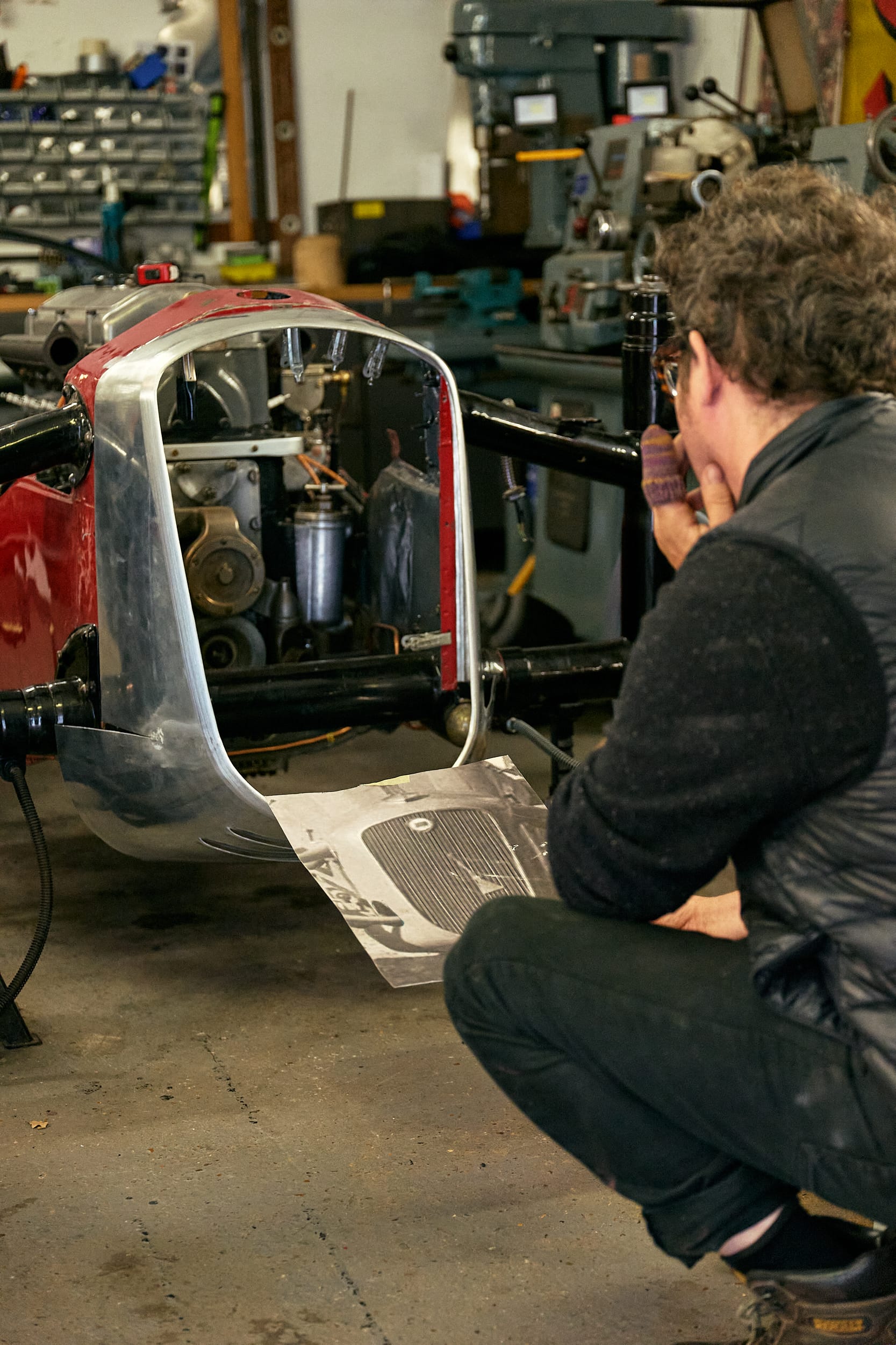 I think these cars were built by, as we were saying, craftsmen and craftspeople, and it's very important I think to use those old machines, early cast iron English wheels and things, they are a much better quality machine. And of course they enable you to do your job by hand, rather than just sending things out for CNCing or things like that. I like the idea that particularly Bugatti, for example, made a lot of his things actually quite simply in terms of machining, which of course enabled him to have a fairly unskilled work labour force in some areas in order to get through the work in a production style. So again, that idea of simple machinery being used by craftspeople is really important to me. I think it maintains the ethos of what the original maker was doing.